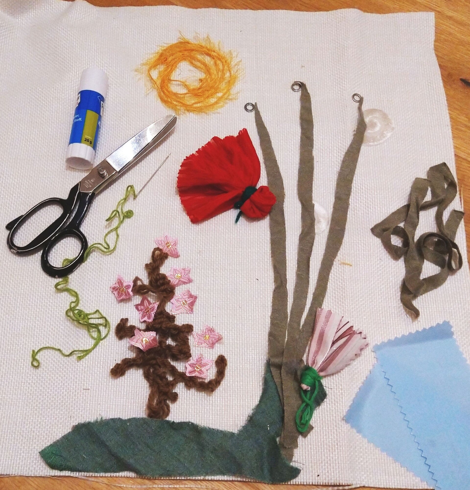 Nähzeug, Schere, Bänder, Stickgarn, Kleber und Ähnliches sind auch sehr nützlich.